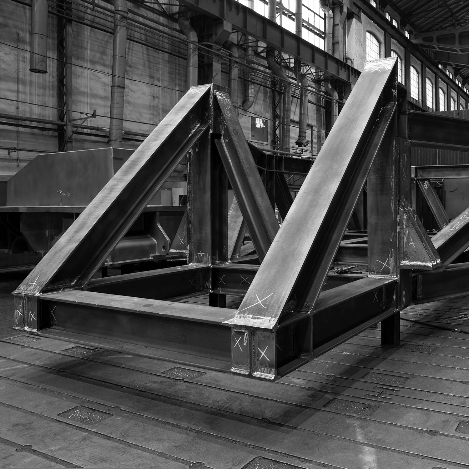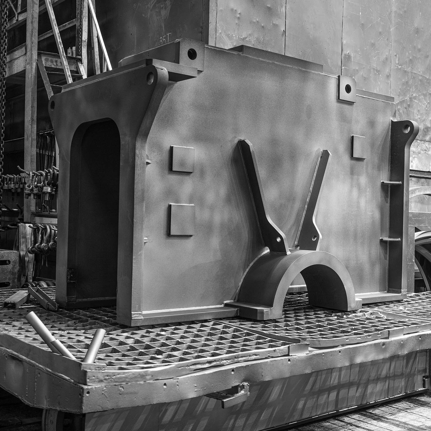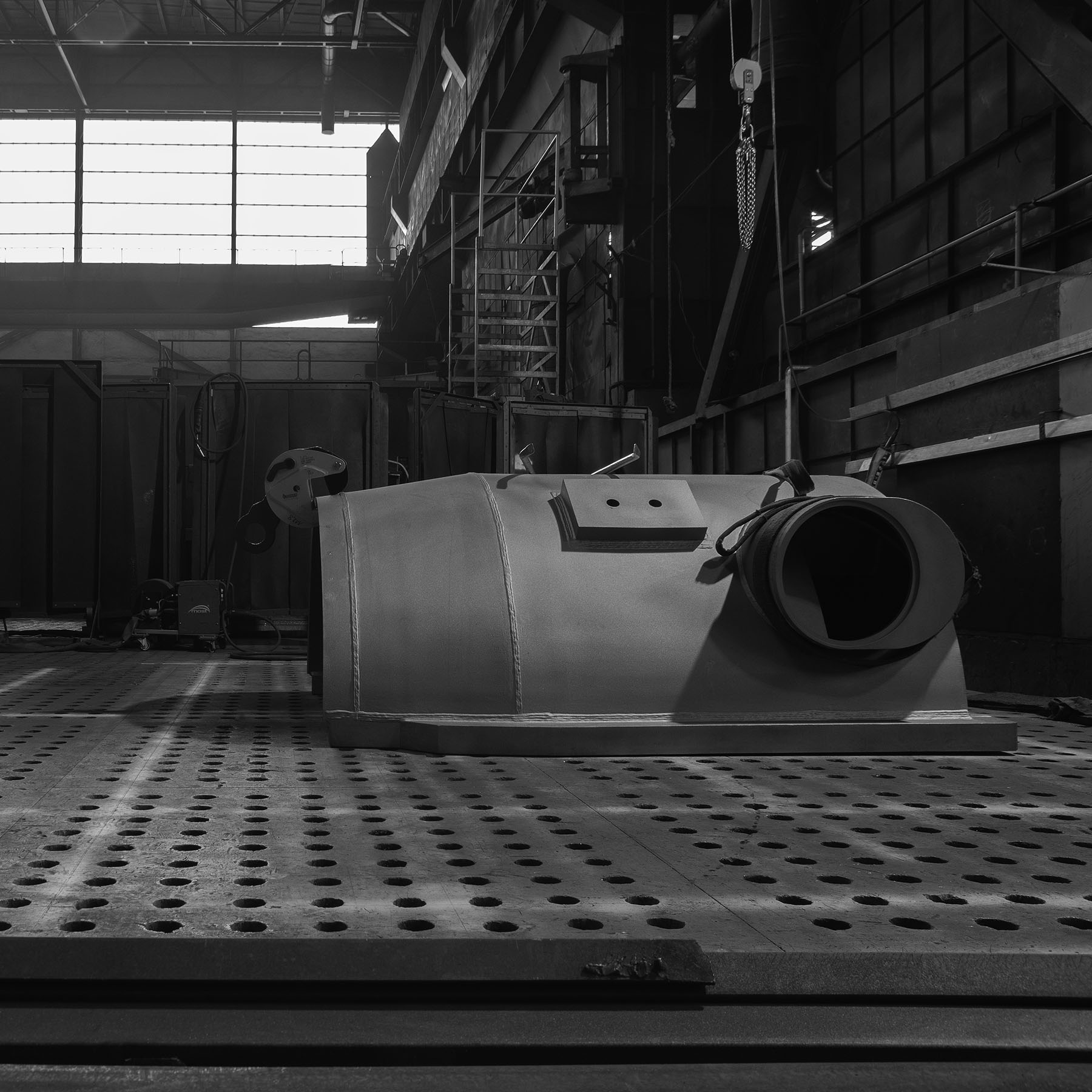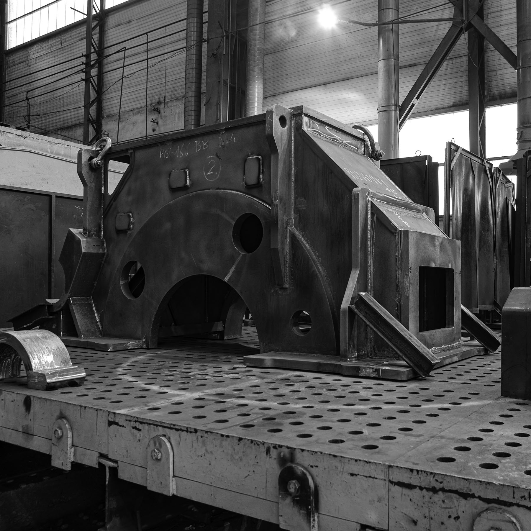 • wykonany z blach o grubości od 40-240 mm • wszystkie elementy składowe zostały wypalone, nadano im fazy spawalnicze, następnie zostały sczepione oraz zespawane • produkt finalny został wykonany z kilu sekcji połączonych w całość.